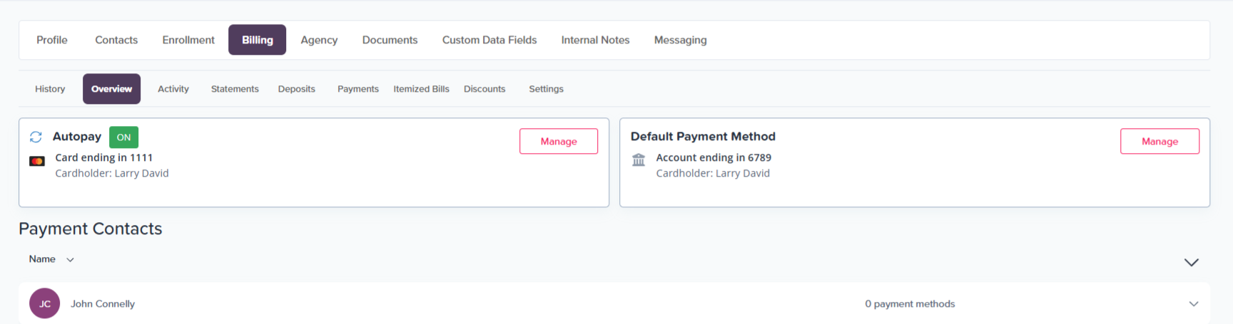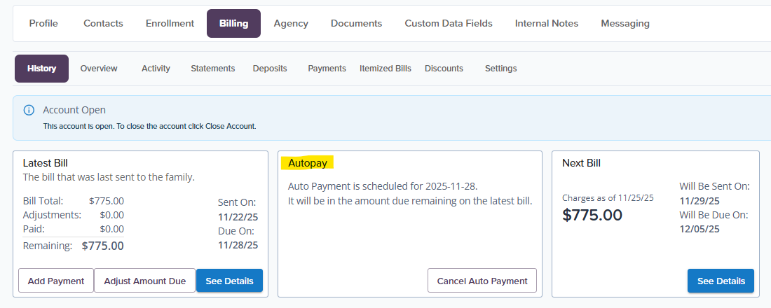 The payment will be applied to the current bill, and the payment receipt will display on the family's Next Bill. Autopay will withdraw any remaining balance from the family's autopayment method on file.