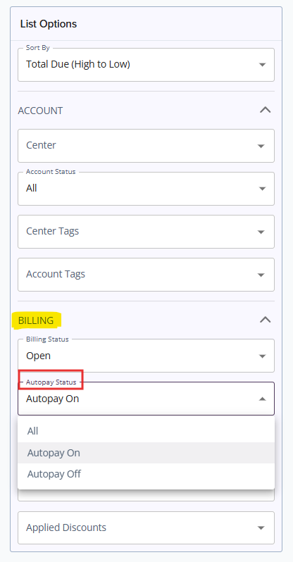Alternatively, within the Families Accounts Search page, a list filter option provides a filtered list of all accounts with autopay on or off.