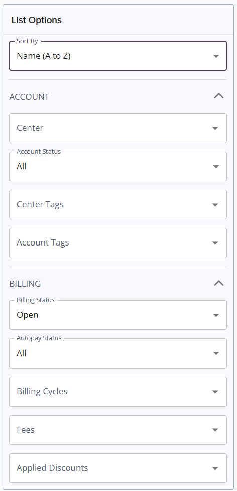 List Options are broken down into 3 sections: Sort by, Account, and Billing. Filters are not limited to one section category, and you can select more than one filter to help define your list.
